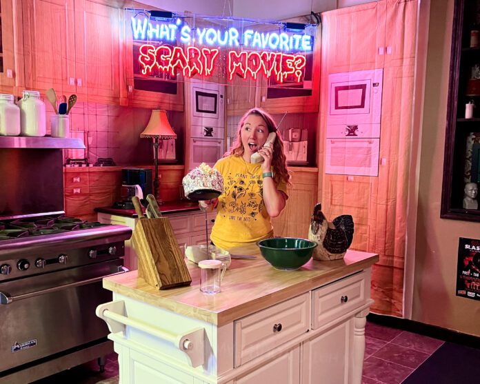 The experience begins with your photo in front of a green screen, placing you into the 90s Slashers poster that gets immediately texted to you. Guests are then free to roam the room to take pictures and video, use props, and appreciate the incredible details of the sets and memorabilia. The scenes are compiled with items from the owners, Erick Yaro and Kiko Bailey’s private collection, and the sets are handmade by Yaro, Bailey, and another exhibit designer, John Lebednik.