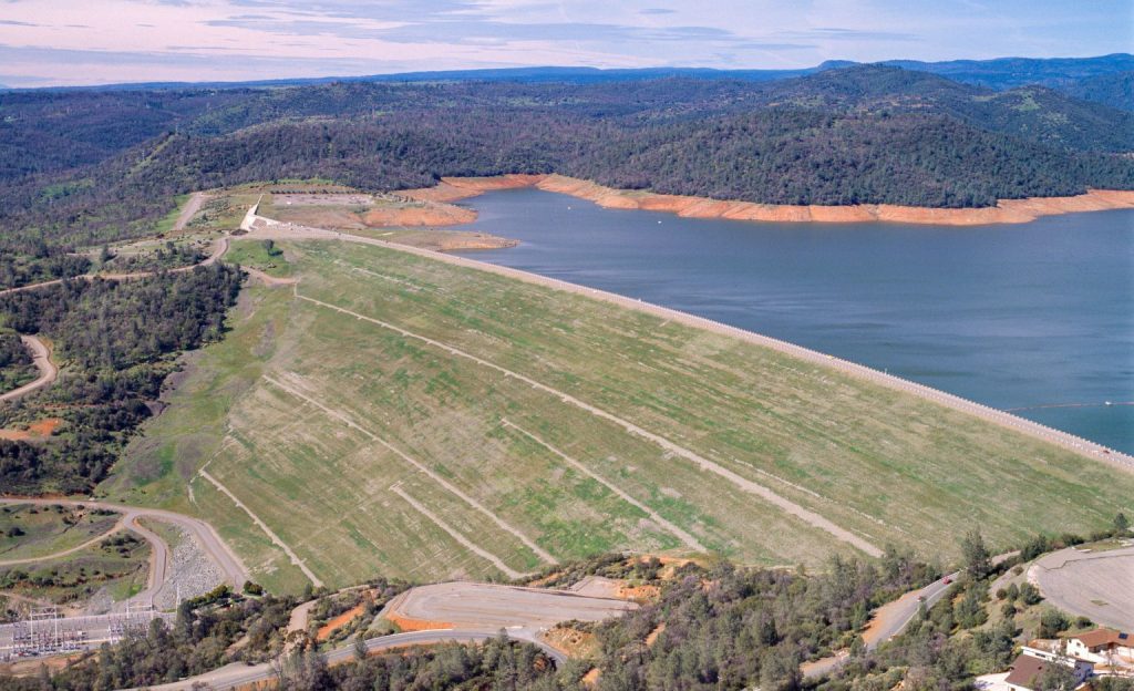 Oroville Dam stands 770 feet tall—43.6 feet higher than Hoover Dam—but unlike its concrete counterpart, it’s an earthfill structure. It’s not strikingly photogenic, blending into the landscape like a natural mountain. As the bus inches along the mile-long crest of the dam, I start to relax enough to record a video of Lake Oroville, the vast reservoir it holds back.