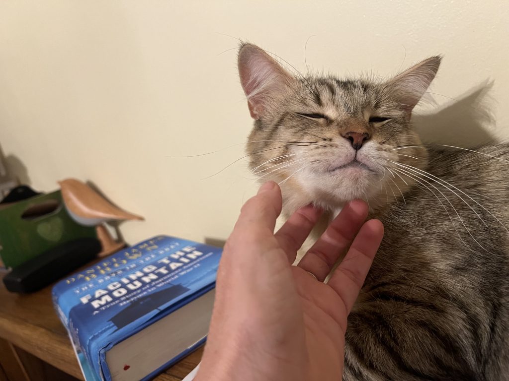 Hi, my name is Floofy. I am a very sweet young lady cat who loves people. I enjoy being petted and hanging out with people on the couch or bed. However I am not a lap cat. While I do love a good nap, I also revel in chasing small balls and toys and I sometimes will bring them to my human to throw for me. I have the most adorable fuzzy feet, probably because I’m part Maine Coon.