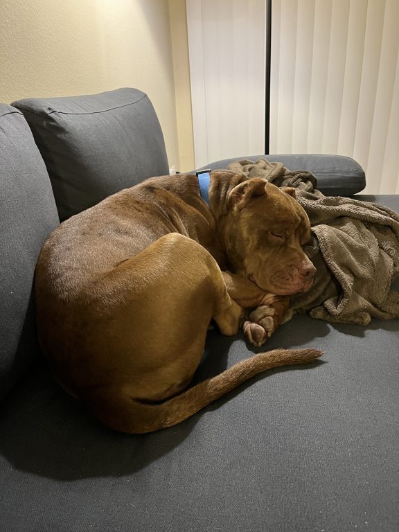 Knuckles loves to cuddle and thinks he’s still a puppy, often trying to sit in your lap whenever he sees an opportunity. He’ll follow you around all day, always wanting to be close to you. Tug of war is his favorite game, and he never barks, maintaining a calm demeanor.