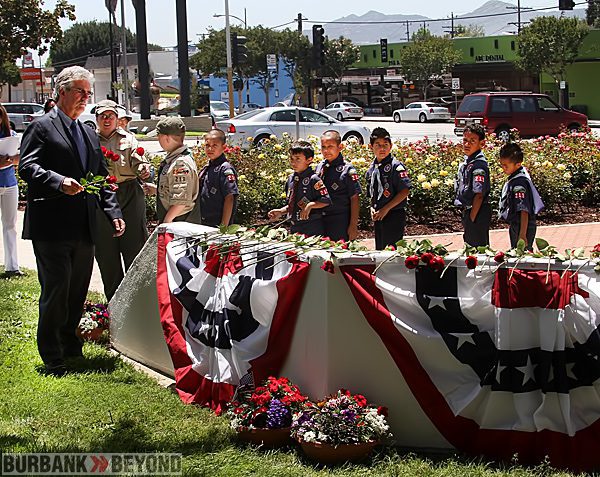 The culminating segment of the day was a Ceremony of the Rose. The commemorative committee members took turns reading the names of those Burbank residents who died during all the wars. Councilman Gary Bric read the list of those who died in the Vietnam War, including his brother, William H. Bric III. Boy Scouts laid a rose for each one around the eternal flame.