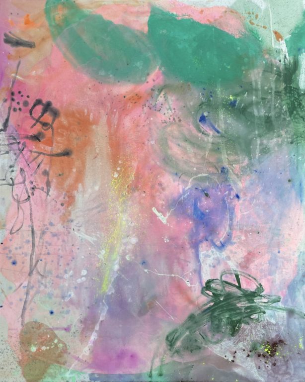 Samantha was born and raised in Outer Banks, North Carolina (yes the one the show is about but isn’t actually filmed there). Growing up she was told she couldn’t make a living doing art so decided to go into fashion and design. Originally attending East Carolina University she then came to California in 2009 to study fashion design at FIDM. Initially her artistic style was influenced by cartoon and realism but then became intrigued by large scale pieces of abstract art where she found more freedom to play and express her ideas. She explored different mediums and decided to use raw canvas with a chemical wash and adding acrylics. She blends and times everything to create unique colors and designs that are always surprising. Part of her process was learning about losing control of her ideas, colors, images and letting it be what it was. Samantha calls her style whimsical, abstract. She does base her pieces on places, events, moments that evoke emotions.