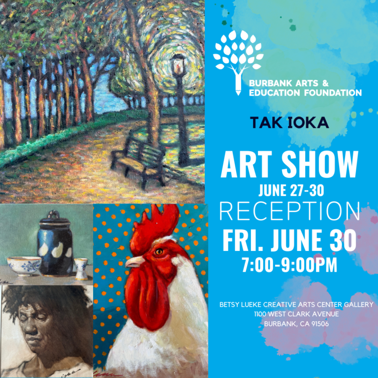 Tak Ioka’s artwork will be available for preview and purchase at the Betsy Lueke CreativeArts center beginning Wednesday, June 28th, and commencing with the reception on the evening of June 30th. The Betsy Lueke Creative Arts Center is located at 1100 W. Clark Ave. in Burbank and is open Monday through Thursday from 9:00 a.m. – 9:00 p.m. To learn more, visit BurbankArtsandEd.org.