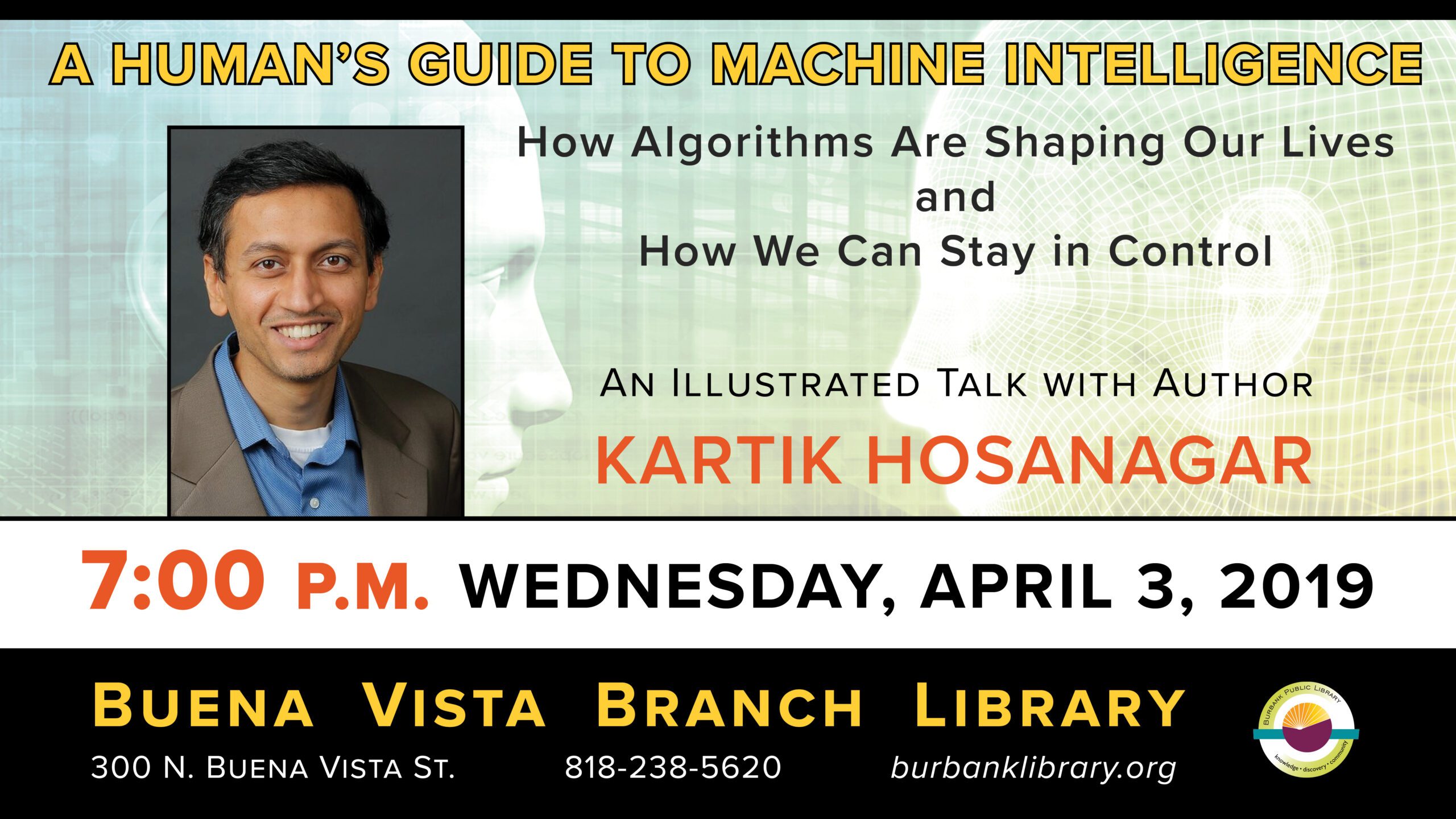 Hosanagar presents A Human’s Guide To Machine Intelligence at 7:00 p.m. on Wednesday, April 3. The Buena Vista branch of the Burbank Public Library is located at 300 N. Buena Vista Street in Burbank. The event is free to the public and there is plenty of free parking available on site.