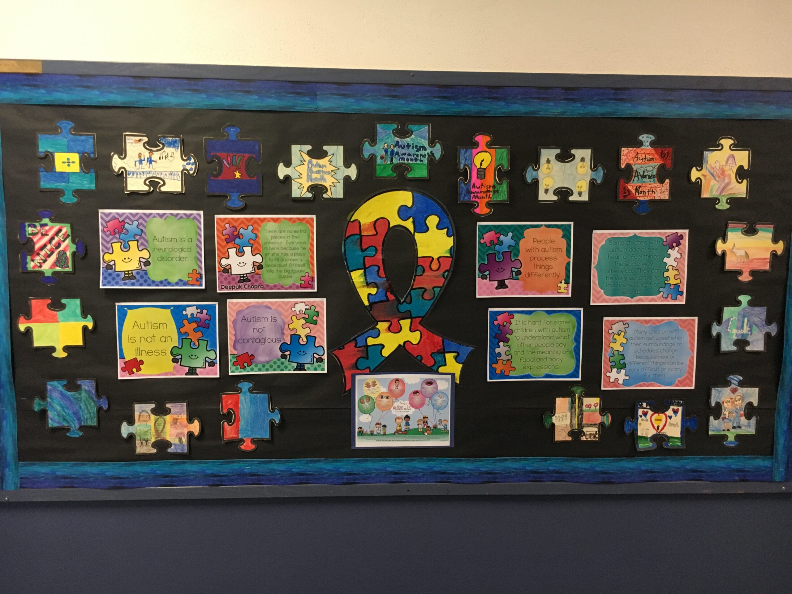 Each student was given a paper puzzle piece and encouraged to decorate it blue or with a picture or a message representing friendship, understanding and compassion, said Collins.