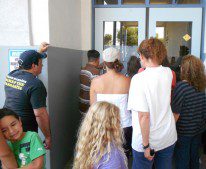 At Thomas Edison Elementary School, students and parents lined up early Friday evening to get a first look at the classroom assignement that were just posted on the school's front door. (Photo by Stan Lynch)