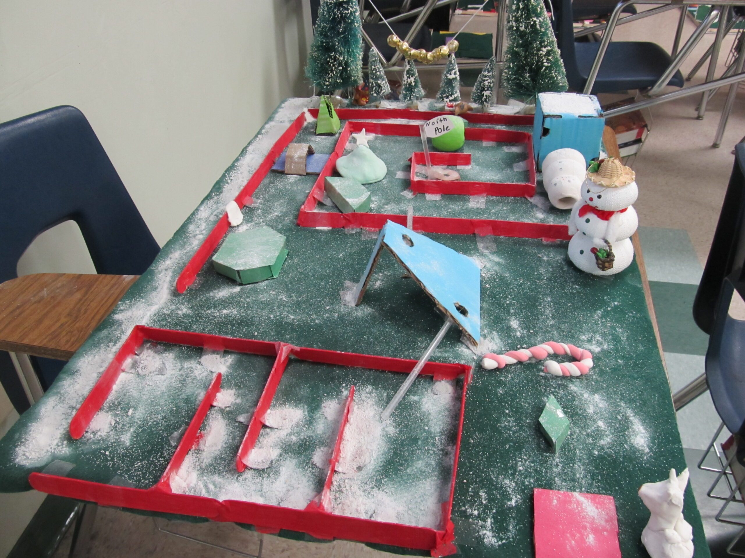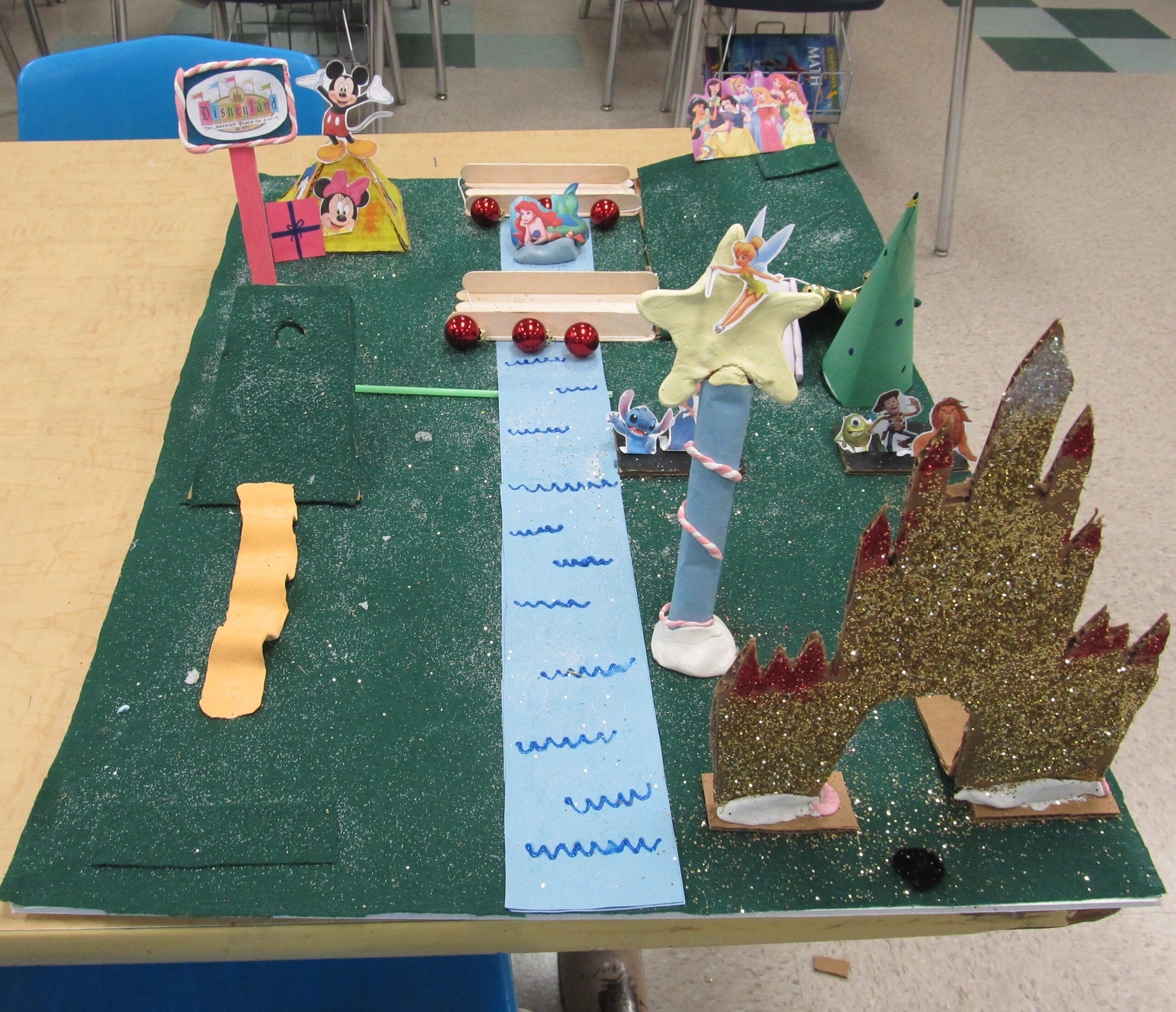 Students first sketched a miniature golf hole design, mindful of square feet constrictions, and were required to use a certain amount of geometric shapes and angles. After making a scale drawing of the project, they figured out how much the wood for the side boards and the carpet for the floor would cost. Then they built their 3-D model using foam board, green felt, straws, string, large popsicle sticks, construction paper, magic modeling clay, tape and glue. Some kids brought in items, like trees, farm animals, characters, colored felt, paint and other decorations, to add to their projects.