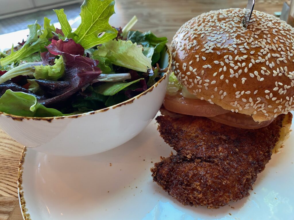 The Chicken Schnitzel Sandwich was made perfectly. Every bite was excellent. Thin pounded chicken breast, dipped in panko crumbs and fried, was seated in between a seeded airy brioche bun with cucumber, tomato, shredded iceberg lettuce and labneh ranch. The simple side salad of baby lettuces, cucumber and tomato, dressed with a light balsamic vinaigrette, was very fresh.