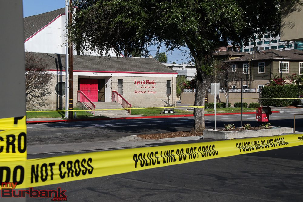 Burbank Police received a call just before 4 pm on Thursday, August 17 of a suspicious package next to the steps of the SpiritWorks Center for Spiritual Living on the corner of Heffron and Pass. Ave.