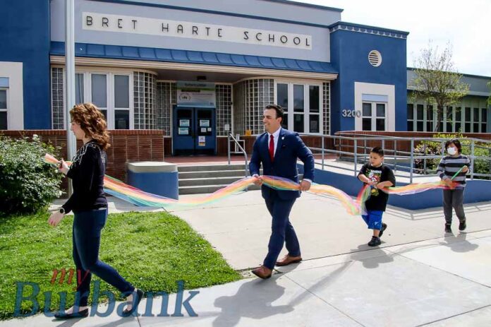 Vice Mayor Konstantine Anthony joined the after-school event at Bret Harte and helped tie the rainbow tule around the trees with the faculty and families. “As the first-ever openly autistic elected official in California, I was proud to participate in the ribbon placing event at Bret Harte for Neurodiversity Month,” said Anthony. It’s so very important that as a community, Burbank is welcoming to all people regardless of race, gender, disability, or neurological type.”