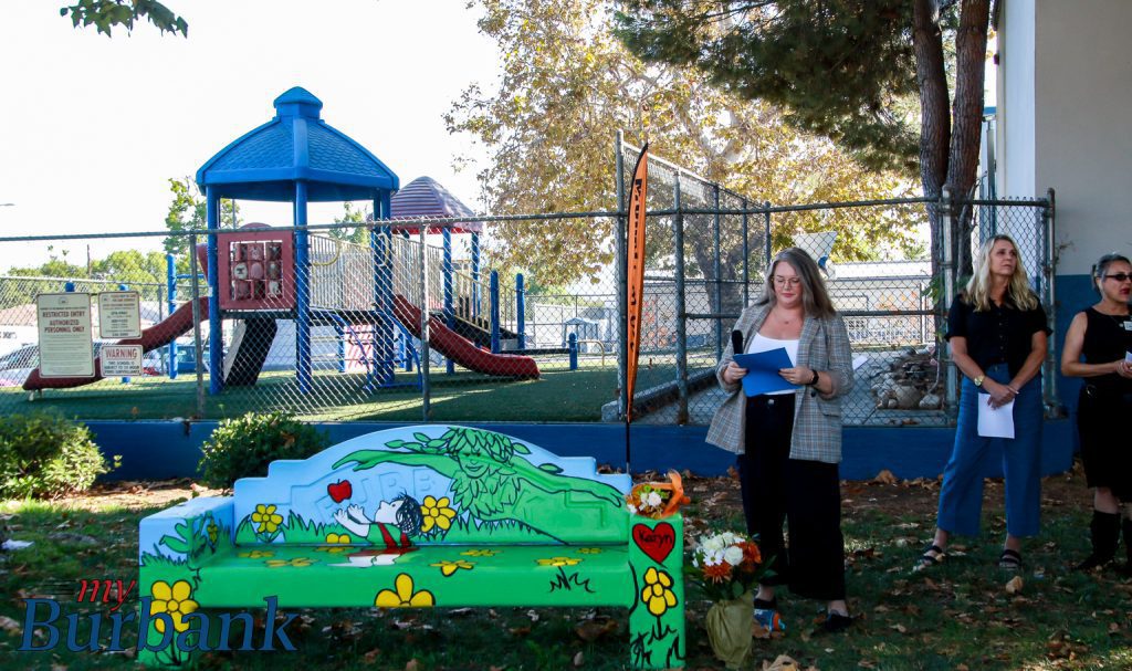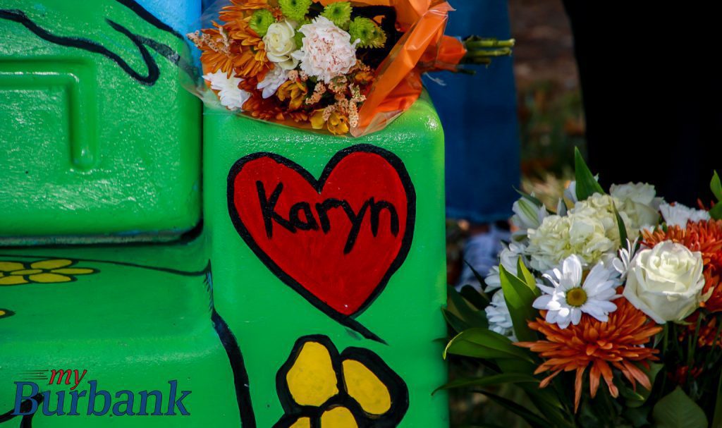 A bench dedication took place on Tuesday, September 24th with over 100 people in attendance including former students, parents, Bret Harte teachers and staff, school board members, the Superintendent, and Karyn’s husband, Vince Lombardo. The bench which was placed in front of Karyn’s classroom on Jeffries Ave. was painted by Muralism, a company that specifically hires artists on the spectrum. Kevin Smith and Jake Reese painted the bench which was donated by the City of Burbank.