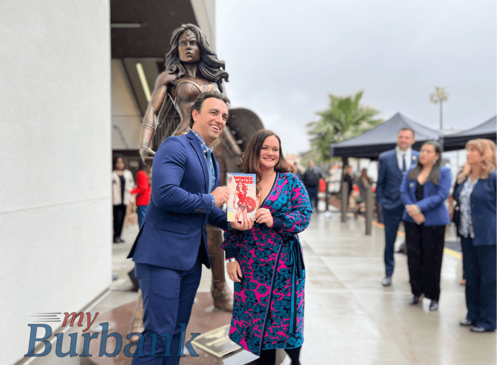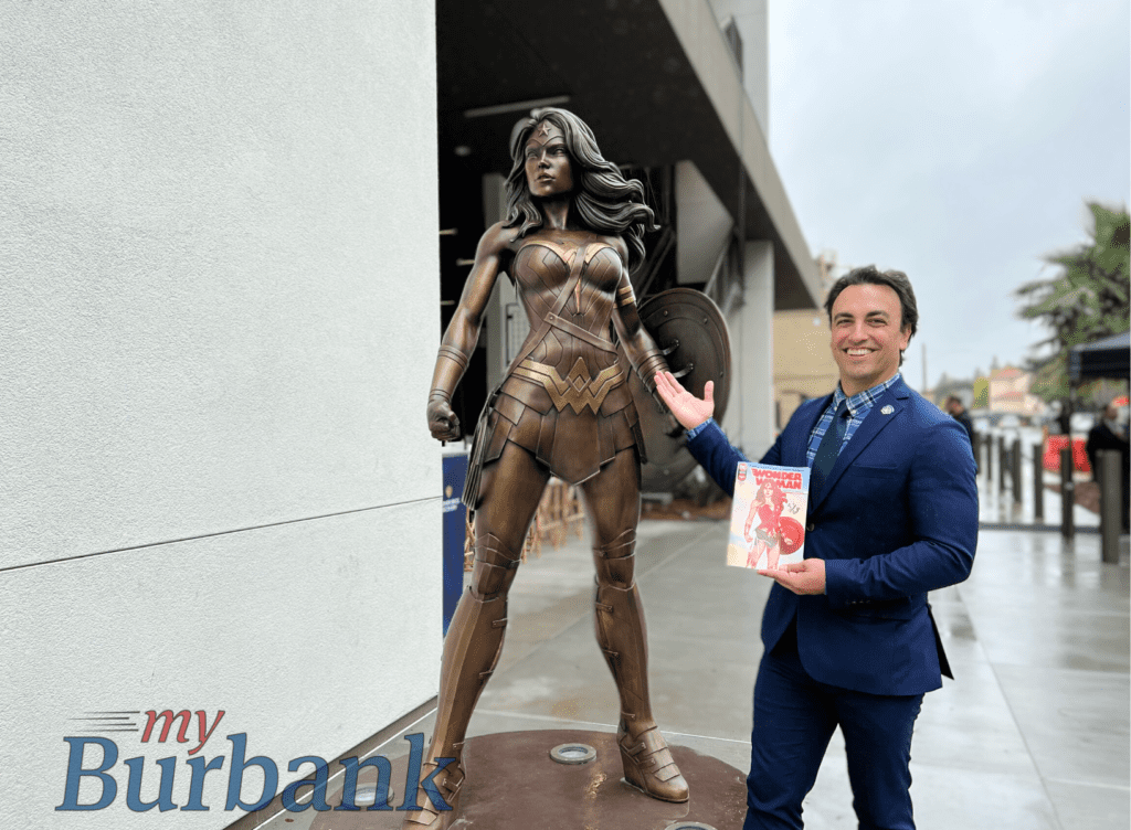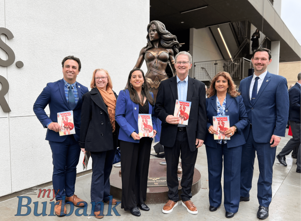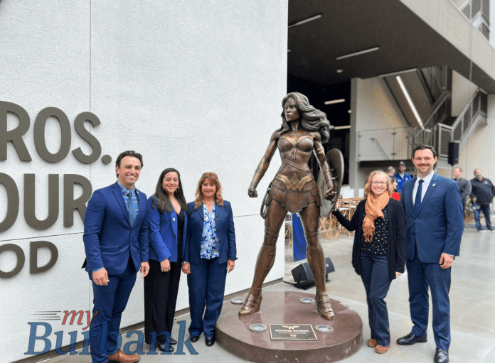 The bronze Wonder Woman statue, which is based on the original drawing by comic book artist, Jenny Frison, stands at the entrance to the Warner Bros. Studio Tour building and is accessible to the public for photo ops. “You’ll notice that our elected body is now a majority of women, a first in the city of Burbank and its history. It’s very fitting of what we’re celebrating here today and shows that this representation has made its way to the top ranks here in the city,” said Mayor Konstantine Anthony, who spoke at the unveiling event.