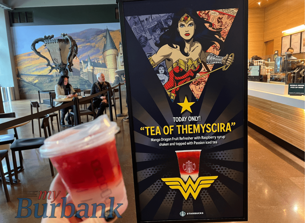 In honor of Wonder Woman, the Warner Brothers Studio Tour building celebrated by displaying original art of the superhero along with merchandise in the center of the lobby. The Starbucks inside the building also celebrated with a limited edition “Tea of Themyscira” that was only available that day and consisted of a Mango Dragon Fruit Refresher with raspberry syrup, shaken and topped with Passion iced tea.