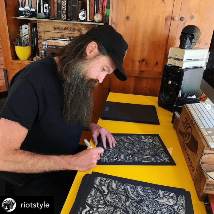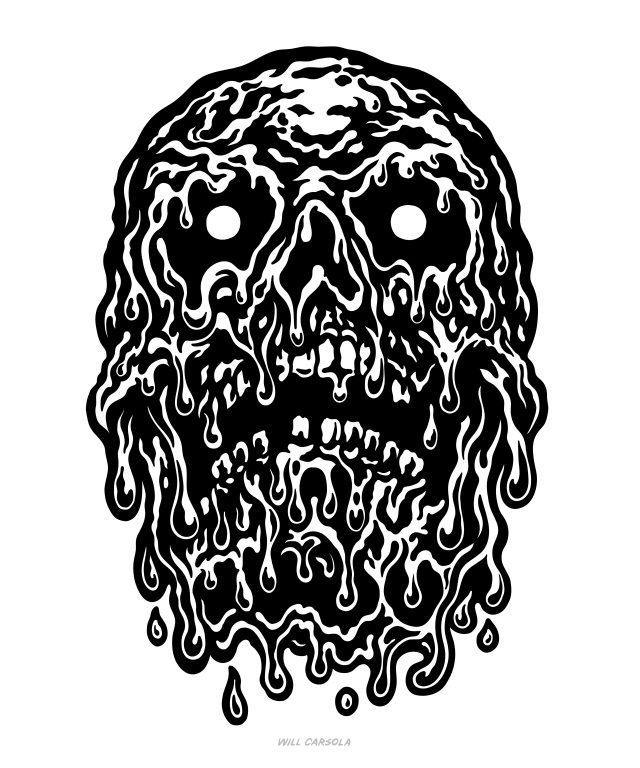 I heard about Will Carsola from Cass and Cory at Yes, Baby on Magnolia. When they told me he had designed the product logo for Liquid Death and was a Burbank resident I knew I had to talk to him. They gave me his Instagram handle and I reached out. I didn’t hear back. I went to his website and his Contact page was an invitation to watch the movie Contact. I loved his sense of humor but was frustrated trying to get a hold of him. I finally got his email and was overjoyed to hear back. Despite his initial aloof nature he was immediately accommodating and friendly. We agreed on a time to meet and sat down together. His beard made an impression as did his height and yet he did not seem the type of person who would create a murderous dog or melting skulls.