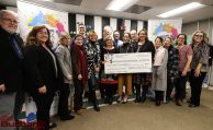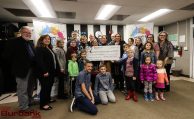 The check was presented to Superintendent Dr. Matt Hill and Board of Education President Dr. Roberta Reynolds in the Theodore Roosevelt Elementary School music room lined with ukeleles and dotted with music stands and other musical instruments.