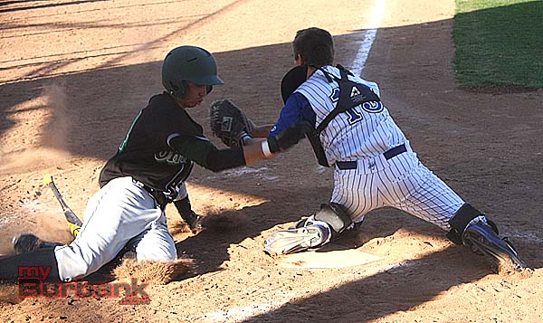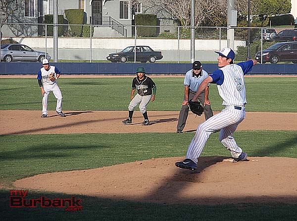 Burbank pitcher Alex Minnick threw a solid five innings after giving up two runs in the first. He gave up one earned run on six hits with one walk and three strikeouts. Minnick left the game with an apparent hand injury suffered on a bunt attempt.