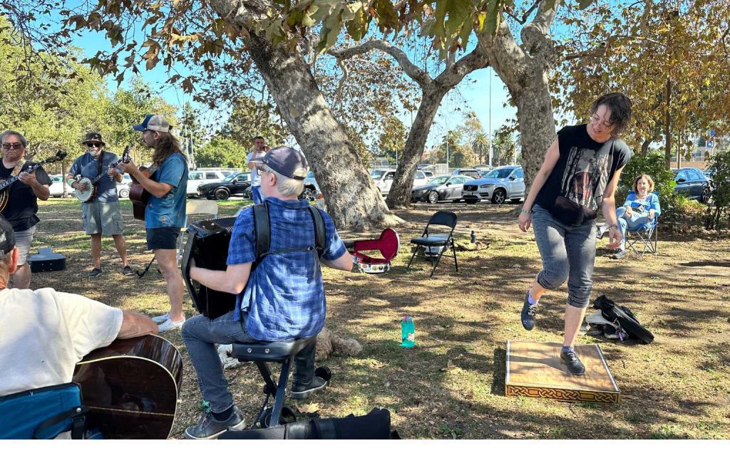 Afton Coombs added to the energy with flatfoot dancing, an improvisational, percussive style performed on a wooden dance board. “I love the jamming, the music, and the sense of community,” Coombs said. Their advice for newcomers? “Just come! As long as you stay in time, no one minds if you’re still learning.”