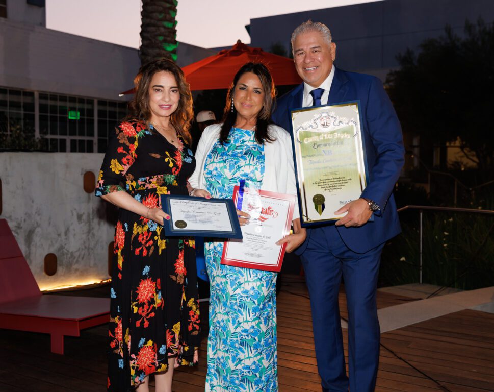 Carlos and Patricia Riveras, owners of Tequilas Restaurant, accepted the Small Business of the Year award, surrounded by family members and employees, including the restaurant’s general manager Juan Vazquez. Patricia shared emotional remarks about the community events they organize, such as their annual toy drive and cancer awareness fundraiser, a cause close to her heart.