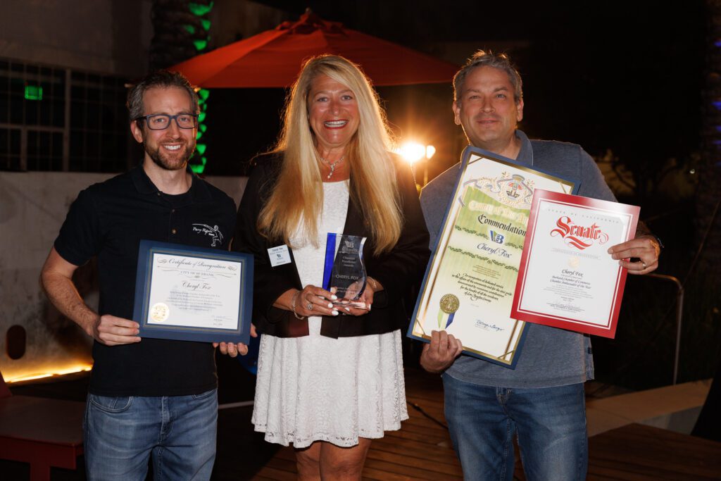 Cheryl Fox, honored as Chamber Ambassador of the Year, has spent decades running businesses in Burbank and now works as a wealth and health coach at Experior Financial Services. Despite recently having a stroke, Fox gave heartfelt remarks thanking her family for their support.