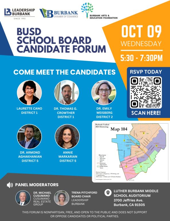 The second Candidate Forum is scheduled for Wednesday, October 9th, at 5:30 PM at Luther Burbank Middle School. It will focus on the five candidates running for the three full-term seats on the Burbank Unified School District (BUSD) School Board. This election marks BUSD’s first-ever by-district election, with candidates representing Trustee Areas No. 1, No. 2, and No. 5. The moderators for this event will be Dr. Michael Cusumano, professor at Pepperdine University, and Trena Pitchford, Chair of Leadership Burbank’s Board of Directors.