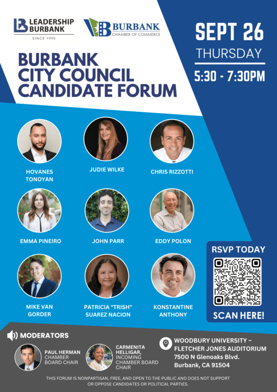 The first Candidate Forum will take place on Thursday, September 26th, at 5:30 PM, at Woodbury University. This forum will feature the nine candidates running for the two full-term seats on the Burbank City Council. These seats carry four-year terms commencing on December 16, 2024, and ending on December 18, 2028. Moderating this forum will be Paul Herman, Burbank Chamber Board Chair, and Carmenita Helligar, incoming Board Chair.