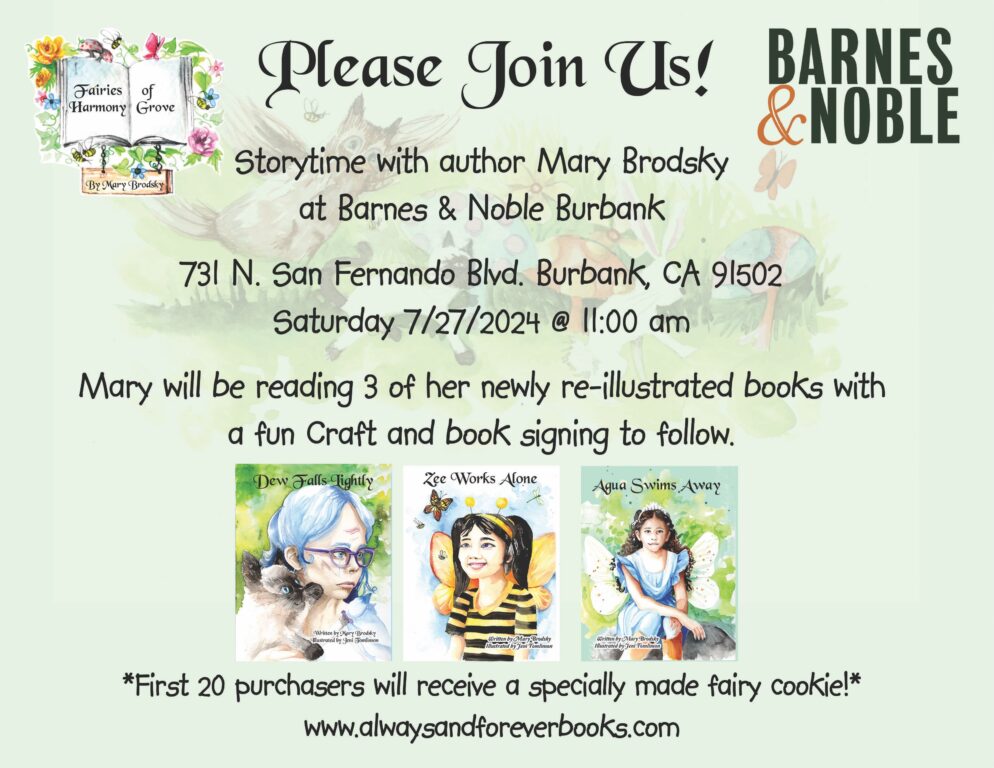 Born, raised, and still living in our beautiful and vibrant city of Burbank, Mary Brodsky, is a beloved children’s author, that has woven tales of enchantment, fantasy, adventure and magic into her books. Brodsky will be holding a story time at the Burbank Barnes and Noble this Saturday, July 27th, where she will be reading three of her newly released children’s books.