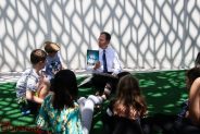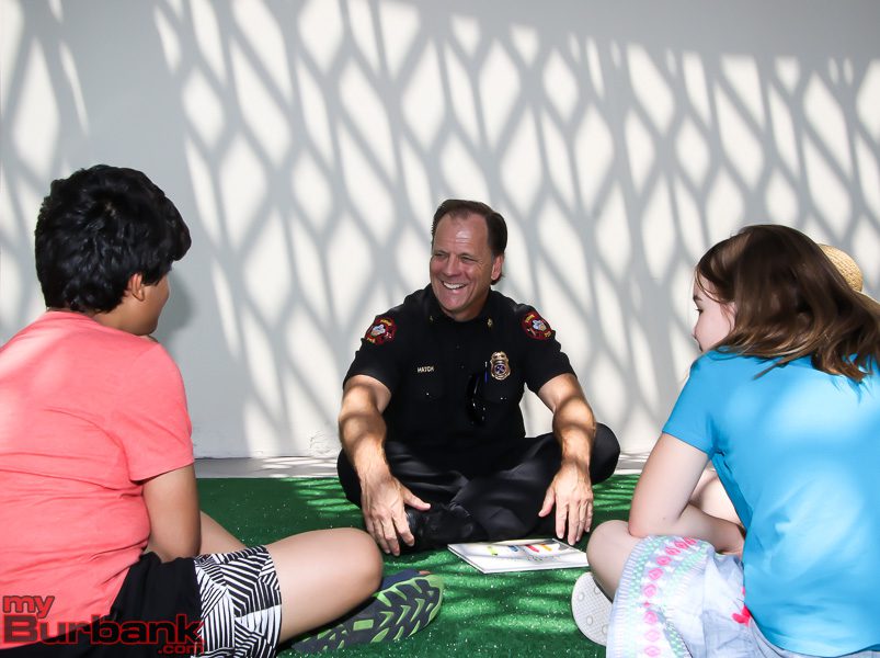Congressman Adam Schiff, Vice-Mayor Sharon Springer, Police Chief Scott LaChasse, Battalion Chief Mark Hatch, Library Director Elizabeth Goldman, Dr. Christian Herrera, nurse Debbie Buffham and teacher Dug Guiterrez read to the children who assembled on the third floor patio of the Burbank Town Center.
