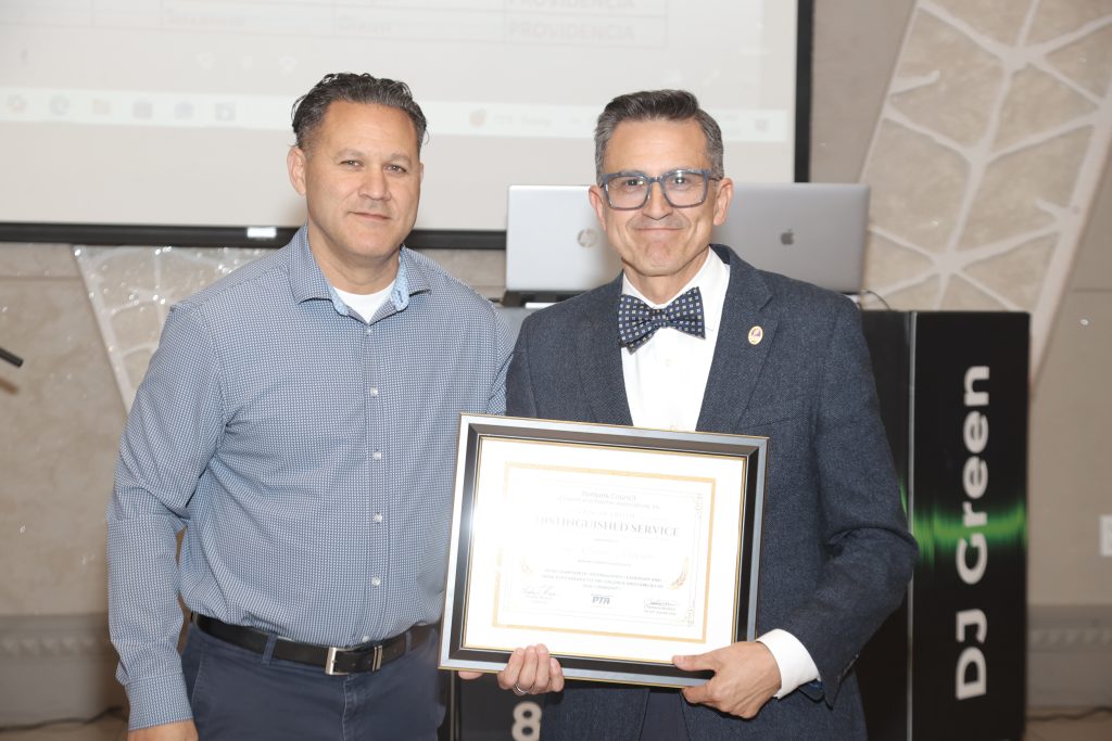 The evening’s highlight was the presentation of a rare and prestigious Distinguished Service Award to BUSD Interim Superintendent Dr. Oscar Macias. Surrounded by his wife, Sandra Macias, and his administrative staff, Dr. Macias was recognized for nearly three decades of service to the district.