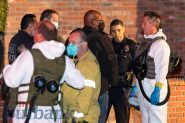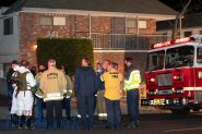 Members of the Burbank Police and Fire Departments, LA County Public Health, and Los Angeles County Sheriff’s Department Hazmat debrief after the conclusion of their operation. (Photo By Edward Tovmassian)