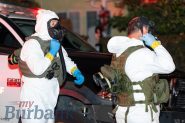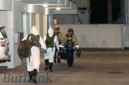 Burbank Firefighters along with members of the Los Angeles County Sheriff’s Department Hazmat (CBRN) Chemical, Biological, Radiological, and Nuclear Specialists team approach the unit to which the white powder was mailed. (Photo By Edward Tovmassian)