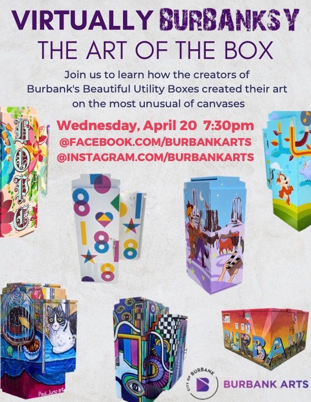 Virtually Burbanksy: The Art of the Box runs online via Facebook and Instagram Live from 7:30 p.m. until 9:00 p.m. on Wednesday, April 20. For more information and to join the online forum, visit https://www.facebook.com/BurbankArts/ or https://www.instagram.com/burbankarts/.