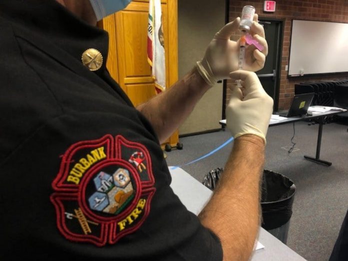 With oversight from the Burbank Fire Department’s Medical Director, Dr. Steve Rottman, M.D., Burbank Fire Department’s Nurse Educator, Britney Alton, R.N., developed the training curriculum in coordination with the LA County Department of Health Services so that the Burbank paramedics may safely administer the vaccine directly at the Burbank Fire Department Training Facility.