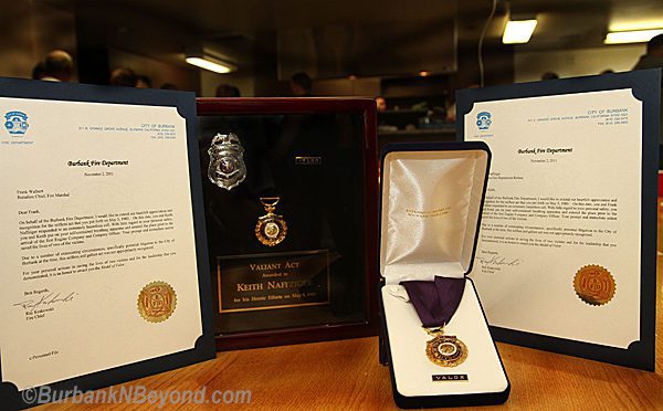 Time has passed but memories have stayed around all these years although some of the firefighters in the room weren’t even born yet. Wednesday, the Burbank Firefighters gathered in the lunchroom of Station 11 to bestow honors to a couple of their fellow firefighters with the highest honor the department gives, The Medal of Valor.