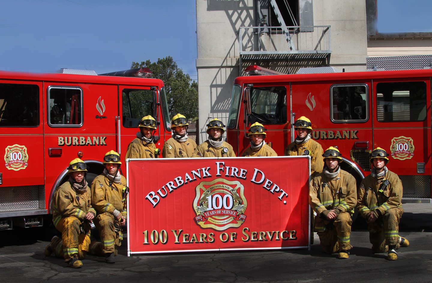The class was given their oath of office, issued their shiny new Centennial Badges, and given a Burbank Firefighter Belt Buckle by Fire Fighter Local Union President Mike McDonald. Plenty of pictures were snapped, and refreshments served then the nine new firefighters donned their protective equipment and went outside to give several demonstrations of what they had learned the past 14 weeks, besides how to survive being a Firefighter.