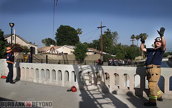 Upon their arrival the captain of Engine 15 requested a truck company to help with removing the injured person, due to the need for special equipment, such as a hoist and a stokes basket. The man who was reported to be a 74 year-old Burbank resident, either jumped or fell into the flood control channel. The concrete-lined channel is approximately 20 feet below the street level. Burbank police are continuing their investigation to determine what happened.