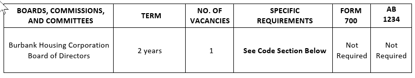 The Burbank City Clerk’s Office is accepting applications for the Burbank Housing Corporation Board of Directors beginning September 2, 2025 through October 1, 2025. Applications may be submitted online by visiting www.burbankca.gov/bccapplication or you can pick up an application in the City Clerk’s Office located in City Hall at 275 East Olive Avenue, First Floor. Completed applications may be submitted online, mailed, or dropped off (no postmarks and no exceptions for late submittals).