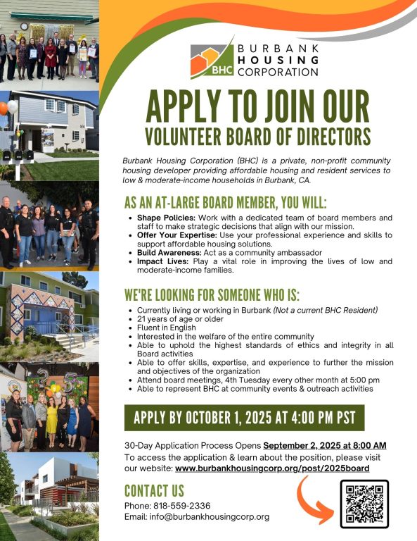 Applications will be available for download beginning September 2, 2025, at 8:00 a.m. on the BHC website: www.burbankhousingcorp.org/blog/2025board