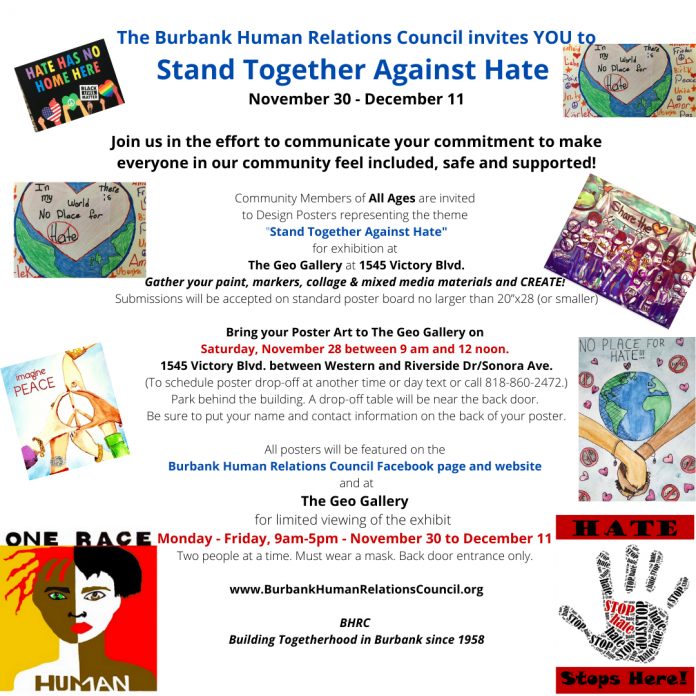 The Burbank Human Relations Council has joined a larger Los Angeles County initiative with a gallery showing and online exhibition of posters supporting the theme “Stand Together Against Hate.” The event runs from November 30 through December 11 and is part of the L.A. County United Against Hate Week which is November 30 – December 6.