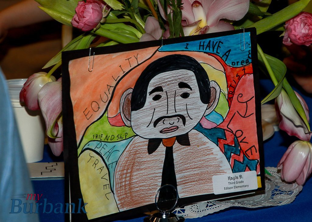 Artistic tributes to Dr. King created by students adorned the walls and served as table centerpieces. Contributions came from Tracy Sorenson’s 2nd-grade class at Jefferson Elementary, Michelle MacNeil’s 3rd-grade class at Washington Elementary, Sarah Schwartz’s 3rd-grade class at Edison Elementary, and students in local artist Jamie Butterworth’s Exploring Art classes.