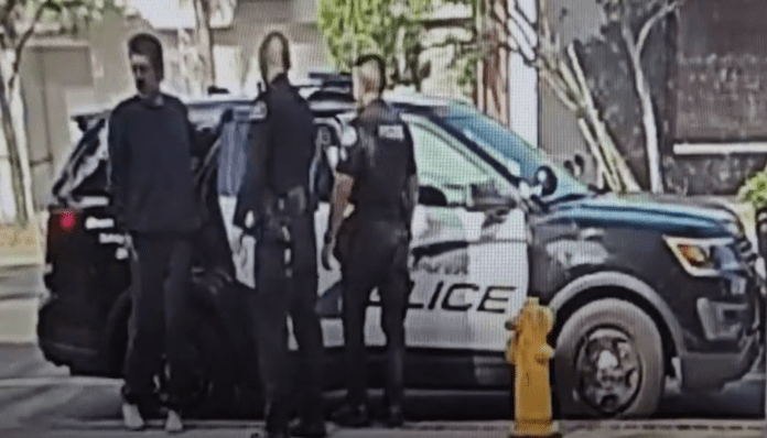 In a clip of the video supplied by Paul Krekorian, police are seen dropping off a man in North Hollywood on Thursday they say claimed he wanted out of the vehicle to get coffee (YouTube)