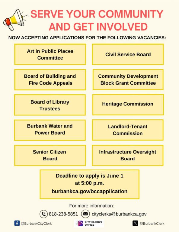 The Burbank City Clerk’s Office is accepting applications for the following vacancies beginning May 1, 2026 through June 1, 2026. Applications may be submitted online by visiting www.burbankca.gov/bccapplication or you can pick up an application in the City Clerk’s Office located in City Hall at 275 East Olive Avenue, First Floor. Completed applications may be submitted online, mailed, or dropped off (no late postmarks and no exceptions for late submittals).
