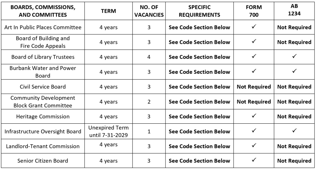 For a description of duties and responsibilities of each Board, Commission, and Committee, please visit www.burbankca.gov/bccapplication