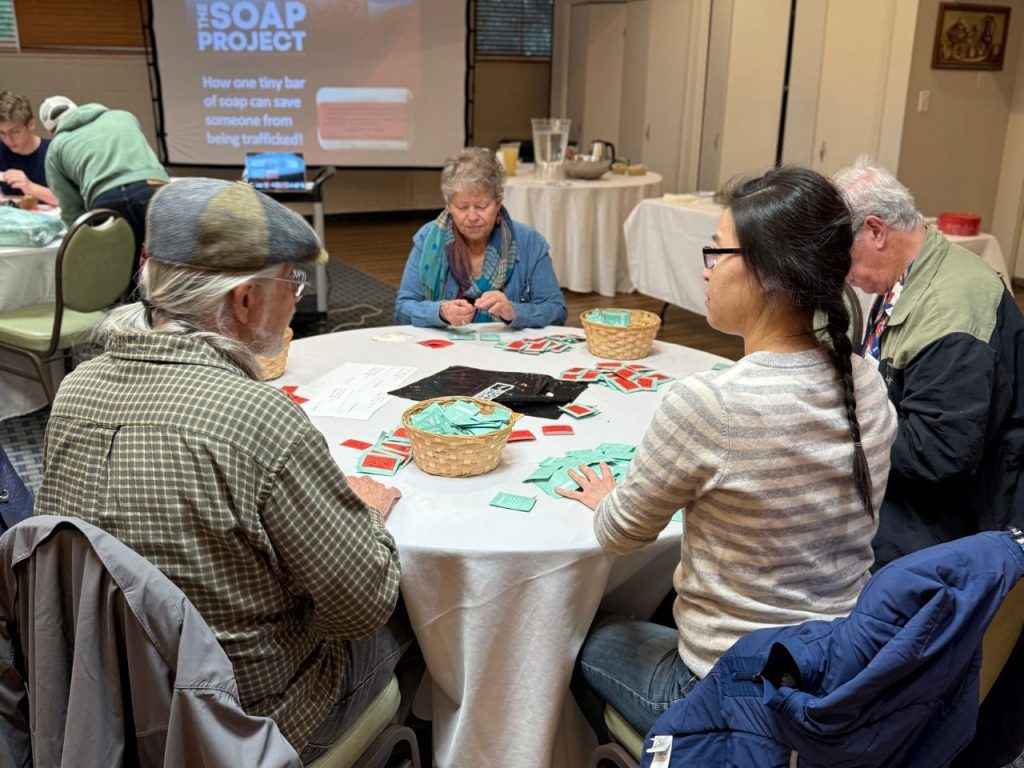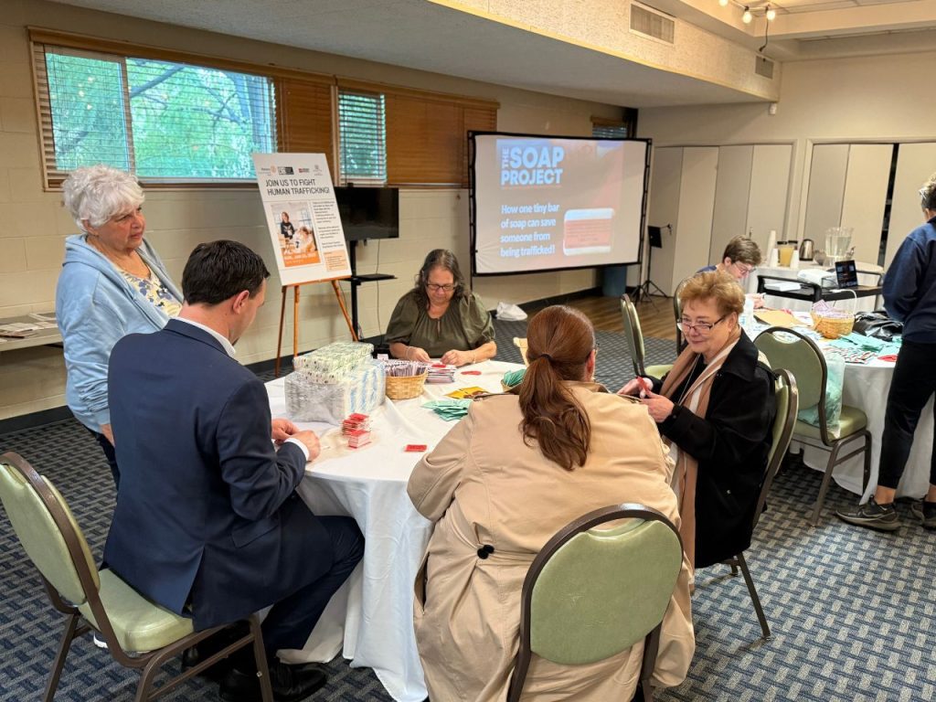 The urgency of the issue was clear as volunteers gathered to take action. Working together, they labelled 7,000 soap bars, makeup wipes, and hand wipes, each carrying hotline information for victims of human trafficking.
