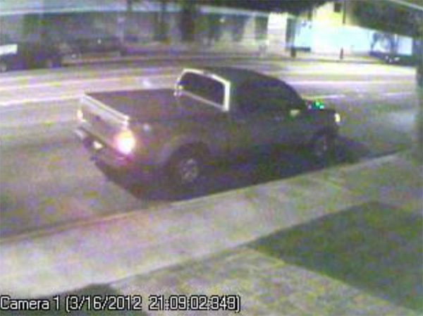 A review of a surveillance video shows the suspect arriving in a 2005-2006, Silver/Gray Toyota Tundra, 4DR, with a matching tonneau cover, chrome rims, and a sticker in the lower left corner of