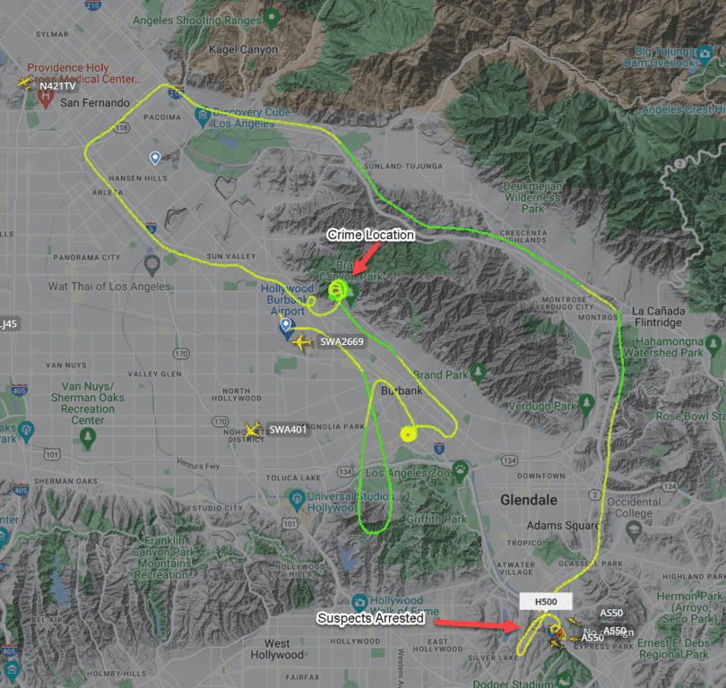 Within a minute, Air 1 was overhead and saw one of the suspects scrambling down the mountain and jumping into a waiting get-away van at Via Latina and Via Pompeii in the Cabrini Villas in Sun Valley.