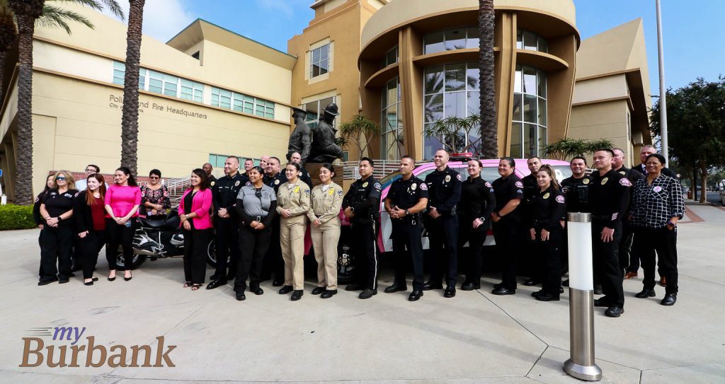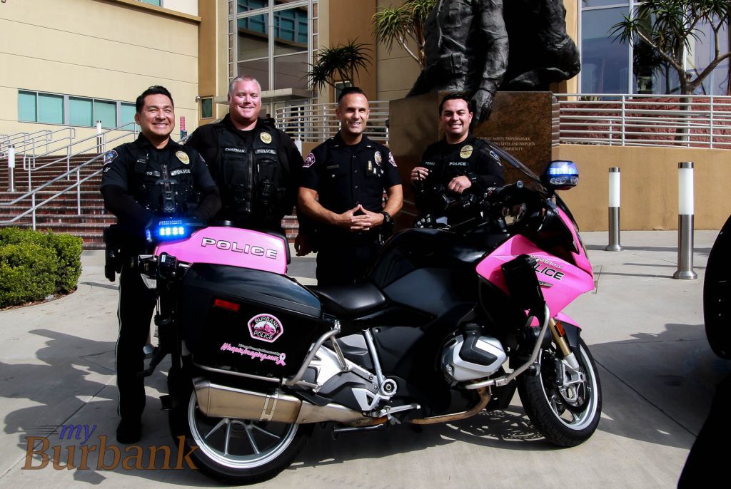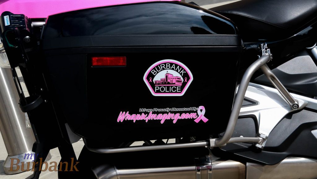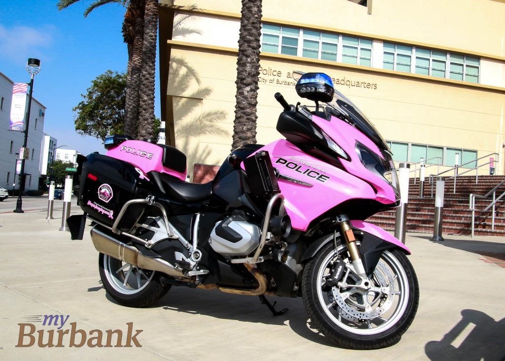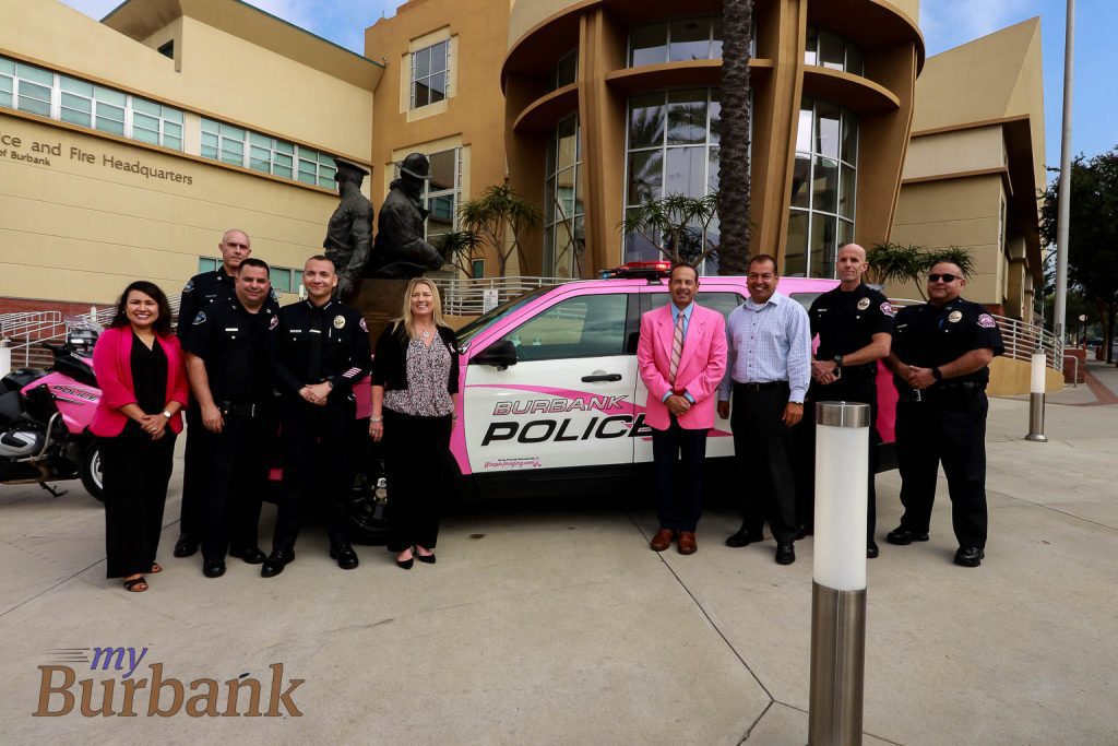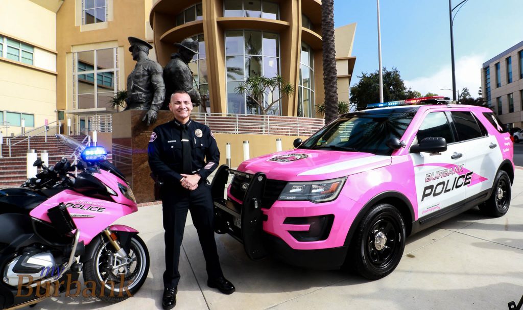 The police cruiser and motorcycle were unveiled at the Burbank Police Station on Tuesday, October 7. The pink police cruiser will be on display throughout October at various community events.
