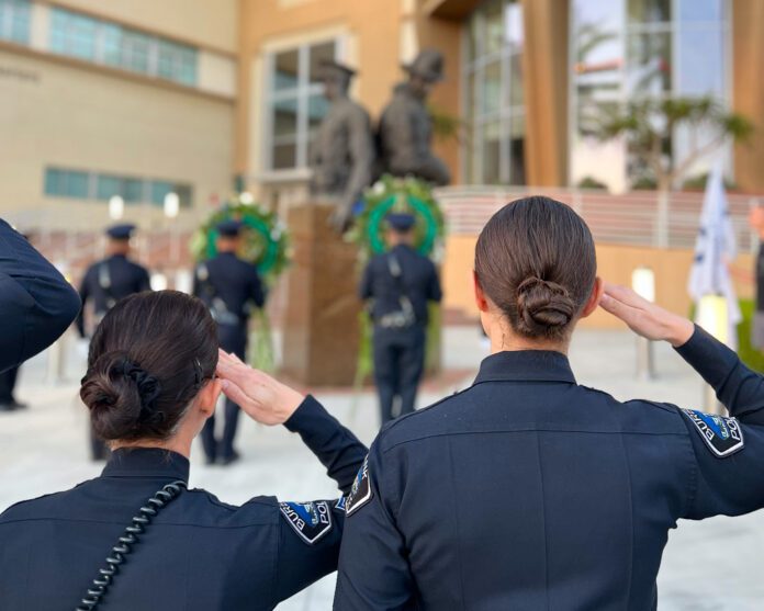 Two wreaths were laid in honor of Pavelka and Colson, with Burbank officers, department staff, and association members present. The red, white, and blue floral arrangements dawned a white and gold sash that read “For Our Fallen Hero” and were placed in front of the bronze statue at the Police and Fire Headquarters building at Orange Grove and 3rd st.
