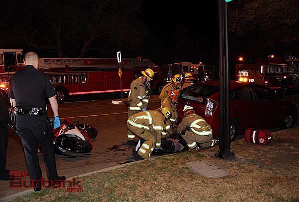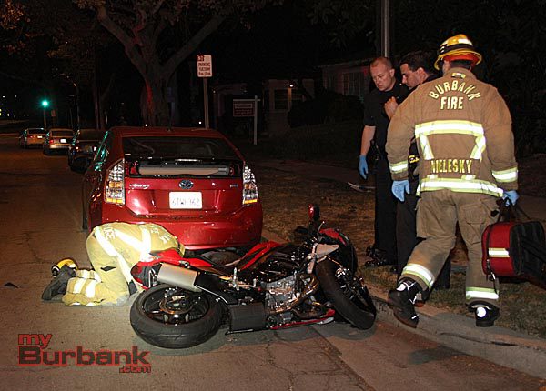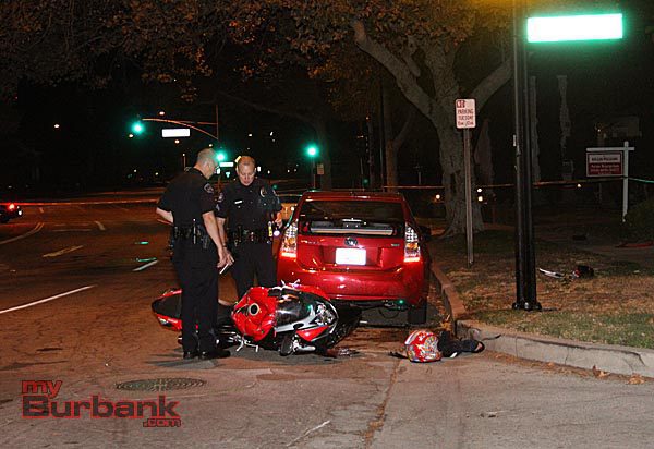 Burbank Police were dispatched to the intersection of Riverside Drive and Gaylord Street at 2:16 a.m. Saturday morning for a reported motorcycle that had struck a parked car.