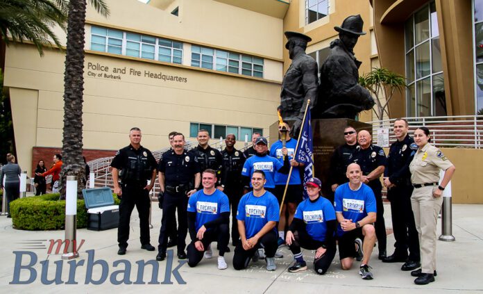 Chief Michael Albanese drove the SWAT BearCat vehicle behind the runners, safely guiding them back to the Burbank Police Station. The runners made it to the station in under 40 minutes and were greeted by Burbank police staff, who clapped and cheered them on as they stopped in front of the bronze statue out front for pictures.