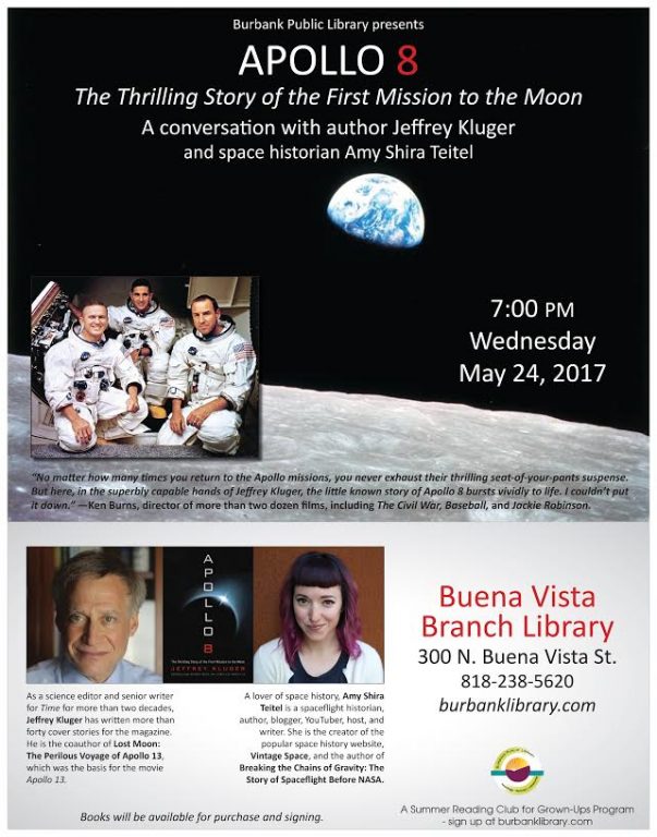 Author Jeffrey Kluger discusses his new book Apollo 8: The Thrilling Story of the First Mission to the Moon with space historian Amy Teitel at the Buena Vista Branch of the Burbank Public Library on Wednesday, May 24, at 7:00 p.m.